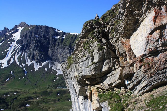 Nun in nordöstlicher Richtung unter der Plattenwand der Leiteren durch und steil zum Südwestkamm des Haupts, den man im Sattel P.2168m betritt. Dem Grat entlang an den Fuss des Murmelchopfs / Chli Haupt (2256m), bis hierher T3. Nun muss man über steiles Gras südlich vor dem Murmelchopf absteigen (T4) um diesen auf zirka 2180m umgehen. Nach dem Abstieg quert man nach Osten über eine Platte (Fixseil) wo man einen Steinmann sieht. Man quert nun über Grasplanggen zum Steinmann wo eine kettengesicherte, gut gestufte Rampe (15m) über einen Abbruch zu einer grossen Platte hinunter leitet (T5; Fels I-II). Über die Platte steigt man zu den Markierungen in einer Rinne bis unter einen Felsen hinauf (T4) ACHTUNG: Anmerkung vom 21.08.2010: Nach dem kettengesicherten Abstieg durch den Felskamin war die Plattentraverse früher mit Fixseilen versehen. Diese sind nicht mehr vorhanden (evtl. ausgerissen, BH sieht auch etwas malträtiert aus). Dadurch ergibt sich hier eine plattige Traverse, welche den Grad T6 erreicht. Es bestünde allerdings die Möglichkeit zu sichern (Stand am Anfang, 1 Zwischenhaken mit Kettenüberresten und BH am Ende). Der weitere Aufstieg ab den blauen Markierungen dann unverändert. Hier quert man über plattigen Fels 5m nach rechts (T5) un dann 7m in gut gestuftem Fels (T4; I) zur Grasflanke hochzusteigen. Auf der Grasflanke erreicht man über Pfadspuren die ausgesetzte Scharte P.2272m in die man 2m abklettern muss (T5; Fels II). Über eine Grasplangge auf der Westseite erreicht man den flachen Gipfelgrat und über ihn den Gipfelfelsen. Man erklettert ihn entweder direkt (Fels II) oder umgeht ihn westseitig um ohne weitere Schwierigkeiten von Norden auf den höchsten Punkt zu gelangen.