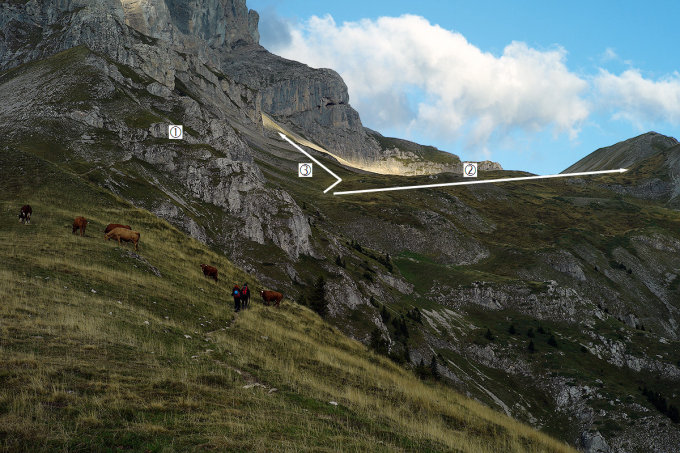 Schwierigkeit: T4, gut gehbares Felsband, Route mit roten Strichen markiert.