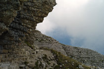 Die Route geht dann in steile und brüchige, aber nicht wirklich ausgesetzte Schrofen über und quert oberhalb eines Felsriegels südwärts auf etwa 2450 Meter Höhe unter die Wände des Petit Obiou, von wo sie dann gerade zur Grathöhe hochzieht. Der Ausstieg auf die Grathöhe ist durch einen Steinmann markiert.