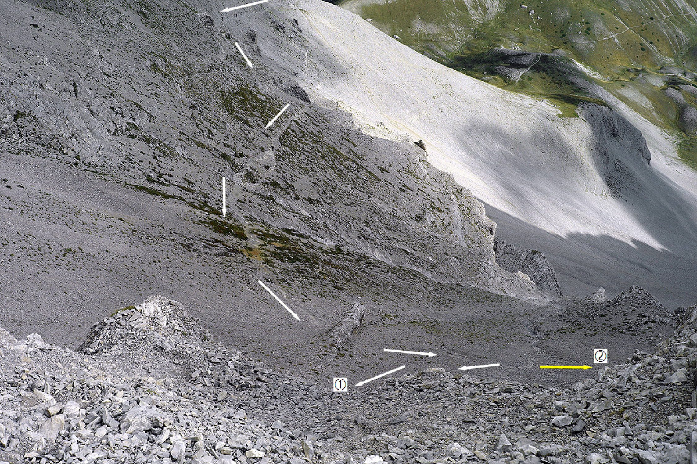 Über den wenig steilen, mit leichten Schrofen durchsetzten Schutthang steigt man empor zum höchsten Punkt.