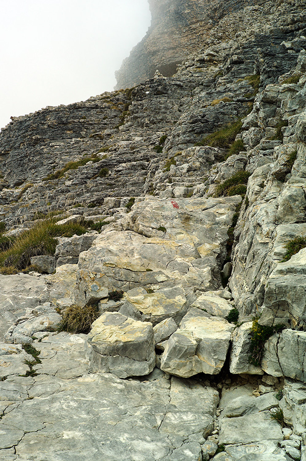 Eine Wandstufe von etwa 50 Höhenmetern führt nun in Kletterei im I. Schwierigkeitsgrad auf plattigem, stellenweise abschüssigem, aber gut gestuftem Fels hoch zum Band der Vire de la Cravate.