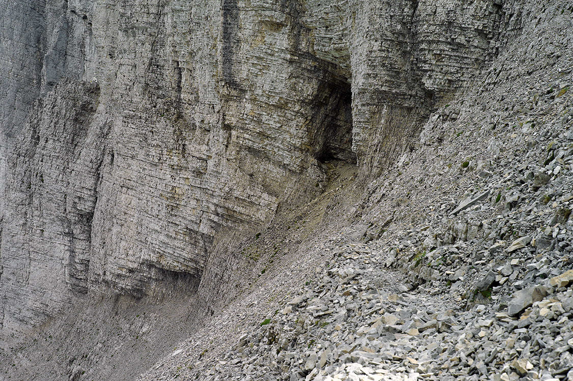 Dem meist breiten, stellenweise überdachten Band der Vire de la Cravate folgend quert man in etwas Auf und Ab westwärts zum schuttigen Südrücken des Gipfelkopfs, den man auf etwa 2600 Meter Höhe erreicht.