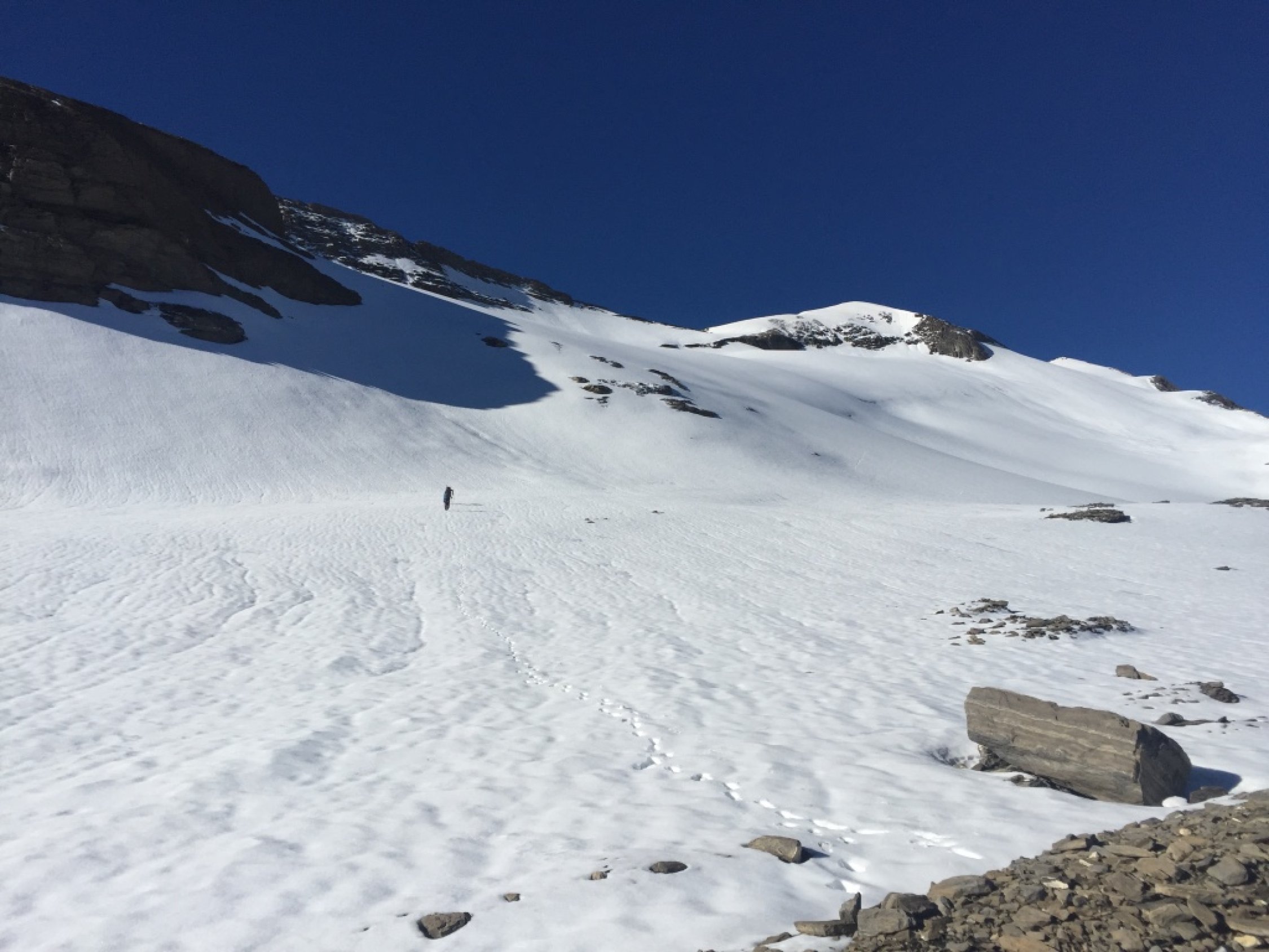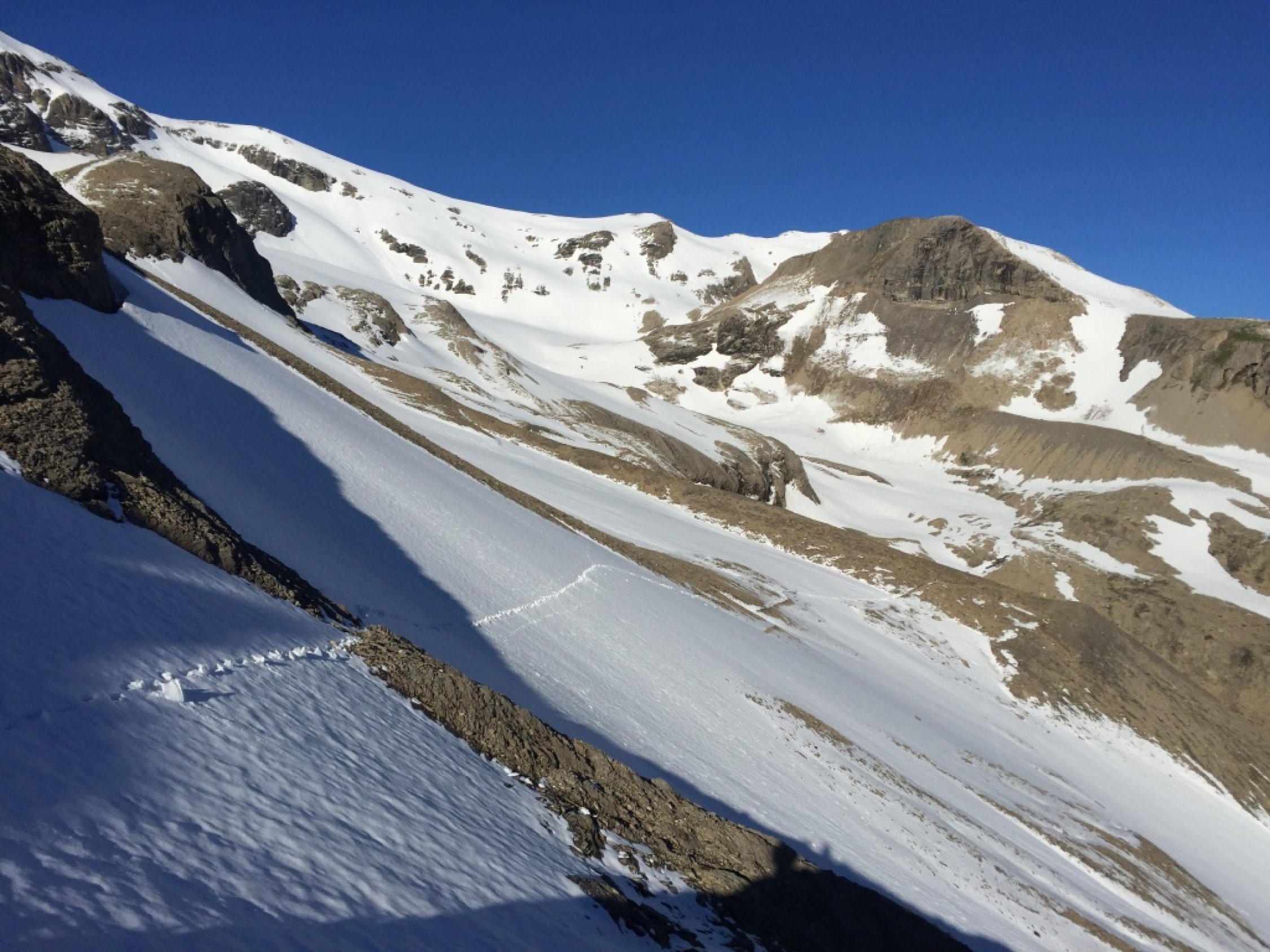 Abstieg über den Ostgrat und in der Flanke hinein zurück zur Aufstiegsroute.