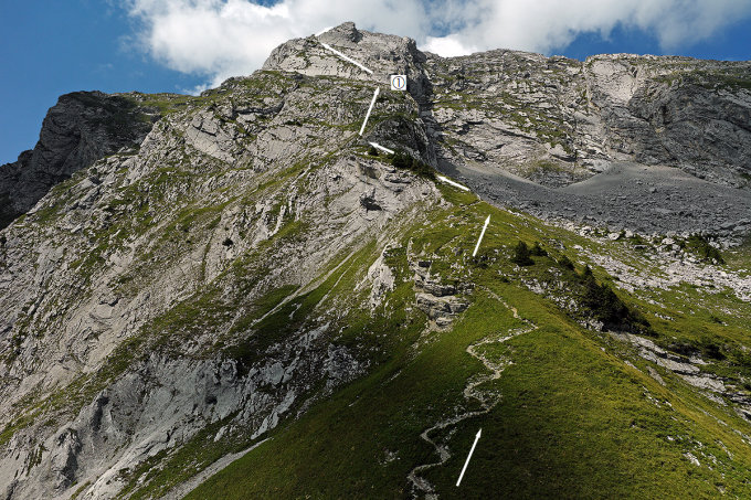 Schwierigkeit: T4, deutlich bis teilweise nur schwach ausgeprägte Begehungsspur, spärlich mit gelben Punkten und weissen Pfeilen markiert.