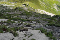 Direkt hinter den Alphütten setzt linkerhand eine erst nur wenig deutlich ausgeprägte Pfadspur ein, die ziemlich ruppig den Grashang Richtung Pointe de l'Arcalod hochzieht. Sie führt auf einen kleinen Sattel (ca. 1750 m), wo sie sich zweiteilt. Man folgt hier der rechten, ausgeprägteren Spur. Über einen weiteren Grashang erreicht man so den nächsten Sattel und eigentlichen Übergang (1873 m).