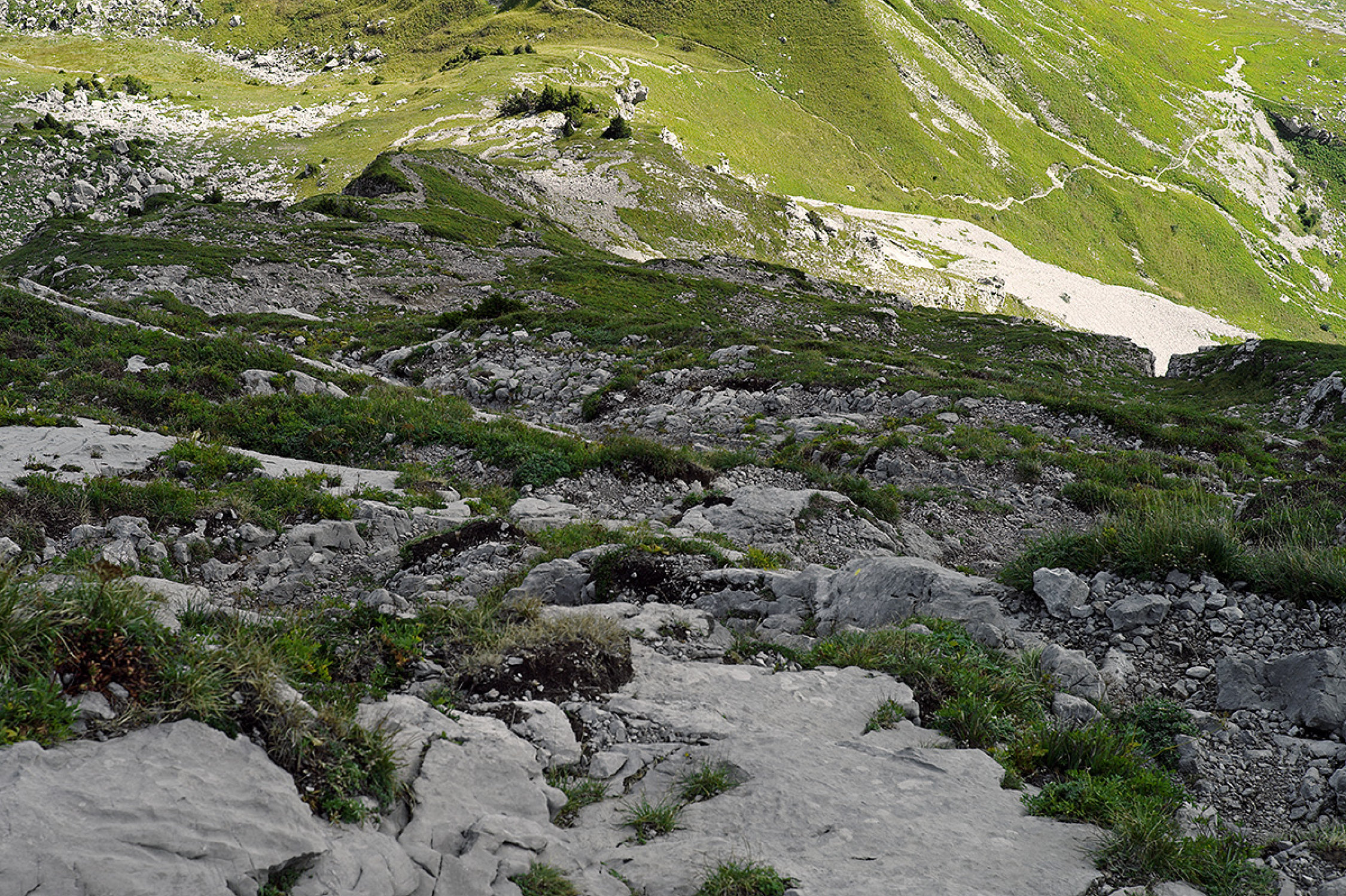 Oberhalb der Stufe setzt die Pfadspur wieder deutlich erkennbar ein. Sie zieht nun linkshaltend hoch und führt so unter Umgehung der Gipfelwand etwas südlich des höchsten Punktes auf den Grat.
