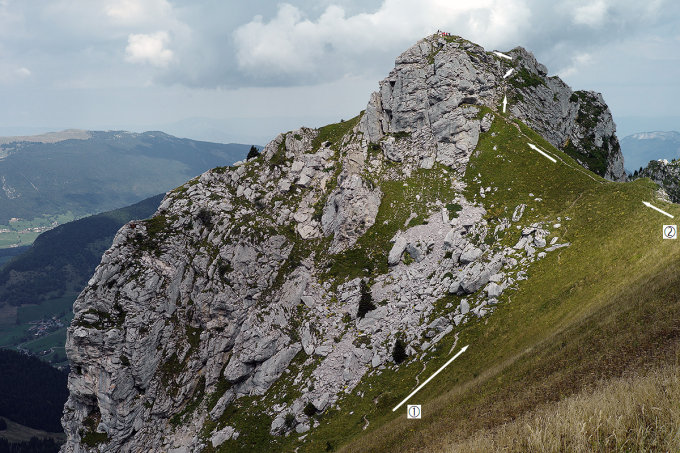 Man folgt hier aber der gerade den Hang hochziehenden Spur und erreicht am Fuss des Dent des Portes auf etwa 1890 Meter Höhe den Gratverlauf. Auf einem Pfad steigt man daraufhin in einer Gras- und Schrofenrinne auf einen kleinen Sattel unterhalb des höchsten Punktes. Ein Teilstück von etwa 5 Metern ist dabei schmal und abschüssig. Über den Grasgrat erreicht man nun in wenigen Schritten den Steinmann am höchsten Punkt.