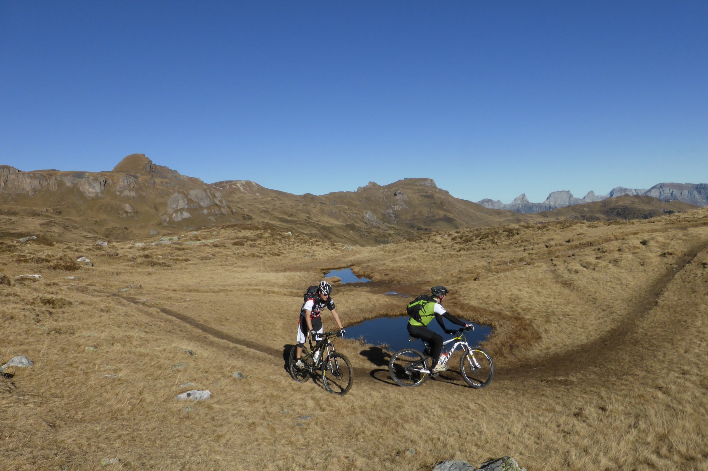 Mit der Seilbahn ab Unterterzen oder mit dem Auto bis zur Tannenbodenalp (1342 m). Von dort mit dem Bike zur Bergstation Maschgenkammbahn (2019 m). Weiter mit dem Bike über Zigerfurgglen bis zur Weggabelung Spitzmeilenhütte und Spitzmeilen und Fursch, Prodalp, Tannenheim. Ab hier zu Fuß zum Wissmilenpass und über den Grat zum Wissmilen. Vom Wissmilen kurzer Abstieg bis zum Einstieg auf den Gipfel des Spitzmeilen. Am Gipfelstock leichte, gut griffige, nicht ausgesetzte mit Ketten versicherte Kletterei zum Gipfel (2502 m). Vom Spitzmeilengipfel Abstieg Richtung Spitzmeilenhütte und zurück zum Fahrrad. Mit diesem über die Furschalp (Tragepassagen) und kurzem Anstieg Richtung Maschgenkammbahn Abfahrt über teilweise geteerte Wege zurück zur Tannenbodenalp.