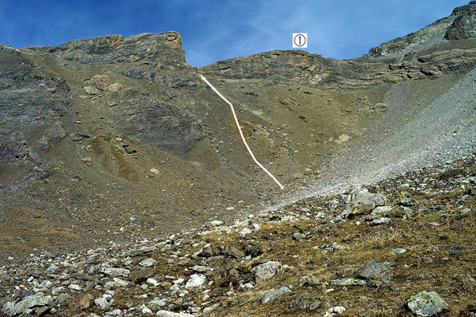 Hier arbeiten wir uns das Geröll hoch zum Gilbiplateau, welches wir westlich des Punktes 2711 betreten. Zuvor erwartet uns im oberen Teil des Schuttes für ein etwa 10- bis 15minütiges Stück die Schlüsselstelle der Tour (sehr steiler, rutschiger Schutt, T4+).