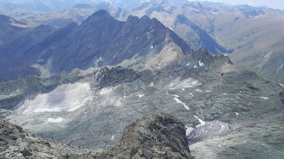Über die Reste des Vadret da Piz Platta und die obere WSW-Flanke zum Gipfel.