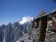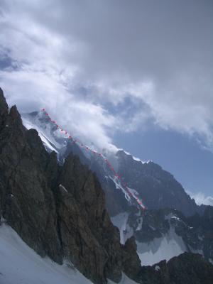 anderntags geht es weiter zum nahegelegenen col und dann den steilen firn- und eishang zum nächsten col, der zurück zum glacier du mt.blanc führt. nach dem erreichen des tiefergelegenen gletschers geht man an den fuss des sporns, umgeht diesen rechts im steilen gletscher, überwindet den randspalt und erreicht nach nochmaligem hochsteigen über den gletscher eine rinne, die endlich auf den grat führt (vom fuss des sporns bis hierher erhebliche eisschlaggefahr. nun folgt man alles dem grat, weicht manchmal ein klein wenig nach links oder rechts aus und erreicht so den bosses-grat kurz unterhalb des gipfels des mt.blanc. schwierigkeit: ZS, je nach akklimatisierung und verhältnissen 5 bis 8 h auf den gipfel.