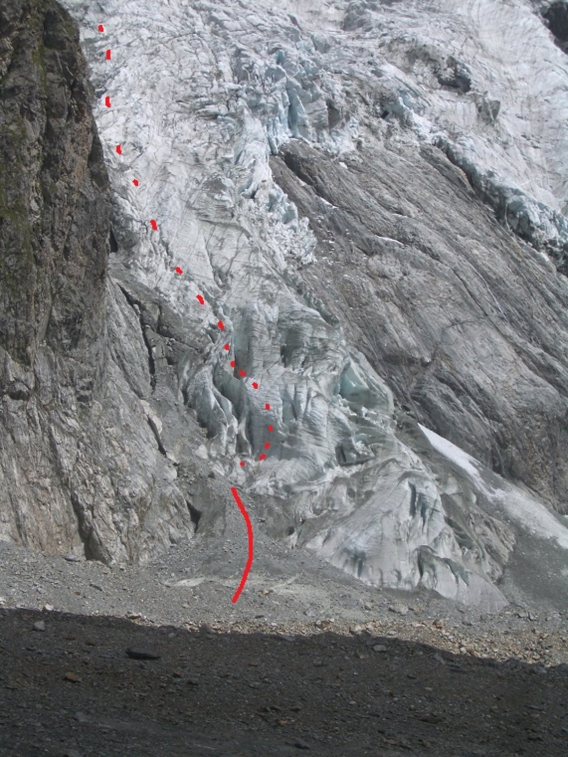 beim zusammenfluss des glacier du mt.blanc mit dem glacier du miage zweigt man gegen E ab und steigt am rechten ufer des glacier du mt.blanc in teilweise steilem eis an. entweder in der ersten grasigen rinne oder weiter oben bei einem waagrechten grasband verlässt man den gletscher und erreicht die markante rinne, die zum nördlich verlaufenden grat führt. nun alles entlang des grates, teilweise etwas rechts davon zu den überresten der alten hütte (hie und da steinmänner) und weiter zur 150m höher gelegenen biv. sella (3371m). es handelt sich um eine sehr alte, wunderbar gelegene hütte, die äusserst selten besucht wird (letzter eintrag von 2010!). schwiereigkeit: WS,wobei man auf dem ausgeaperten gletscher sehr gut auf den frontzacken stehen können muss; vom see bis hierher circa 5 h).
