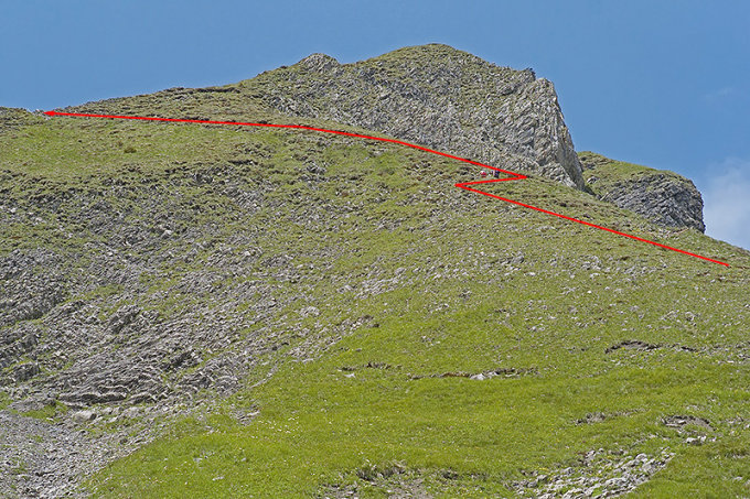 Durch Schrofen und Gras führt der Pfad nun nirgends mehr ausgesetzt über diese rasch zum Gipfelkreuz.