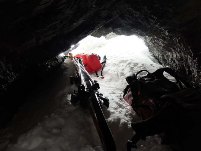 Bemerkung 2: In der Stn. Eismeer gibt's mehrere grosse Auschaufenster - der Stolleneingang befindet sich in bei dem nördlichsten Fenster. Lichtschalter für den Stollen gibt es da auch. Der Stollen hat 3 Ausgänge, die unterste kommt als einzige in die Frage. Der Ausstieg auf den Gletscher kann durchaus problematisch sein - durch Schnee blockiert, Bergschrund, Abseilen nötig... Auskunft über aktuelle Verhältnisse kann man manchmal von grindelwaldSPORTS bekommen.