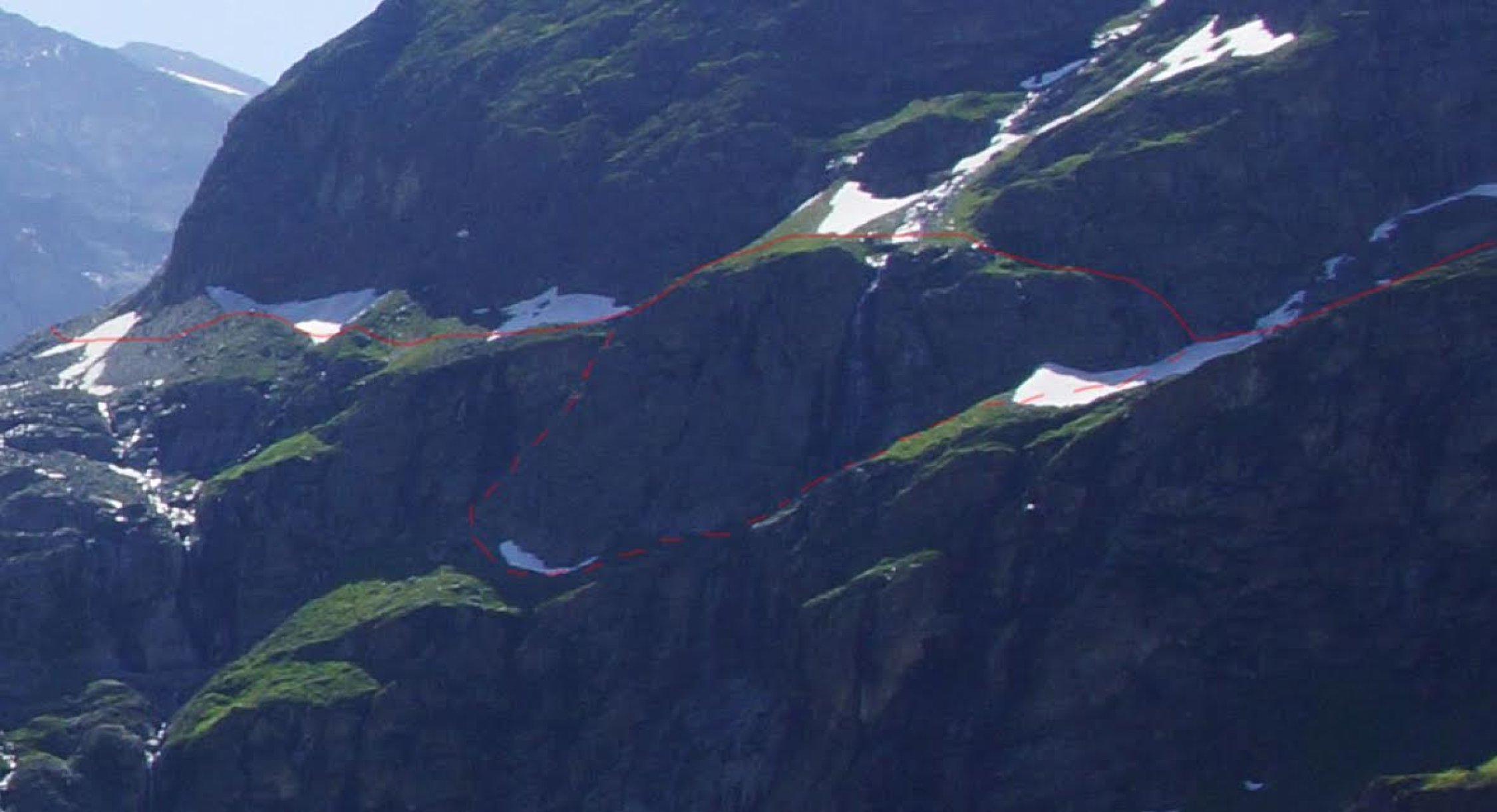 Von der Stn. Eismeer über Stollen auf den Gletscher. Über diesen auf Ischmeer, weiter auf den rechten Gletscherufer und bei Kote 2381m weg vom Gletscher. In Griene Wengen stellt den nächsten Hindernis. Aufschwung auf den Band auf 2220m ist an 2 Stellen möglich. Steigeisen und Pickel können hier gute Hilfe leisten.