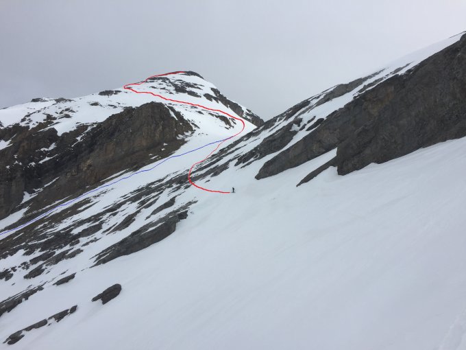 Ganz am Ende des Brünnlital nach links drehen und steil und ziemlich ausgesetzt zu einem felsdurchsetzten Band queren. Dort einige Meter über die Felsen klettern (Fixseil) und anschliessend wieder mit Ski oder zu Fuss zum Plateau beim Fisipass. Von dort ohne Schwierigkeiten mit Ski zum Gipfel, ev. Skidepot kurz unter dem Gipfel.