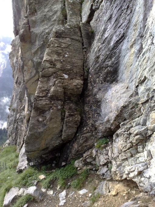 Dem Wanderweg folgend zum Gipfel (Gällihorn) zum Wandfuss, Marschzeit etwa 50 Minuten. Fünf Minuten vor der markanten Wegbeschilderung ist der Einstieg, siehe Foto.