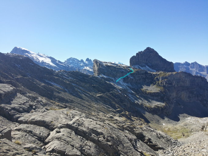 Abstieg bis ca 2440m (Beginn der Fixseile) gleich. Nun folgt man weiter dem Hahnenband in NE-Richtun. Dabei traversiert man immer direkt unter der Felswand. Die Traversierung ist einfach, jedoch hat es nur undeutliche Wegspuren und das Gelände ist sehr ausgesetzt. Über das Plateau von Ryffen erreicht man den steilen Abhang beim Gämssetz. Der richtige Einstieg ist hier nicht ganz einfach zu finden. Er befindet sich ca. in der Mitte des Felsbandes und ist mit einem Steinmann markiert. Man steigt nun zuerst über ein Grasband und später über eine Geröllhalde ab (der richtige Abstieg führt auf der LK über den Schriftzug "Gämssetz" hinunter, auch wenn einem scheinbar bessere Wegspuren dazu verleiten in Richtung Fulenwassergrat zu gehen). Man erreicht Ängigriessen ca. 2240m. Links dem Graben entlang bis ca. 2520m aufsteigen, dann den Steinmännern entlang, sofern vom Schnee her sichtbar via P.2496 - P.2404 - oberhalb hindrist Griessenboden steil hinab, weiter gegen P.2297 - Griessenbänder - Rugghubelhütte 2290m.