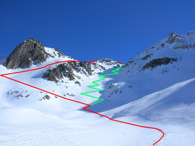 Vom Parkplatz in Realp dem Winterweg zur Rotondohütte folgen bis der Witenwasserenstafel (2221 m) erreicht wird. Nun in südöstlicher Richtung über immer steiler werdende Hänge zur Lücke südlich vom Punkt 2853 (Zuoberst bis gegen 35°). Diese steile Stelle kann umgangen werden in dem man eine grosse Kurve nach Norden macht. Der Nachteil ist jedoch, dass man oben dann einige Meter zur Lücke absteigen muss. Jetzt in südlicher Richtung durch die Mulde (früher war hier der Gh. di Lucendro), dann hinauf zum Skidepot am kurzen Ostgrat. Nun über diesen auf den Gipfel.