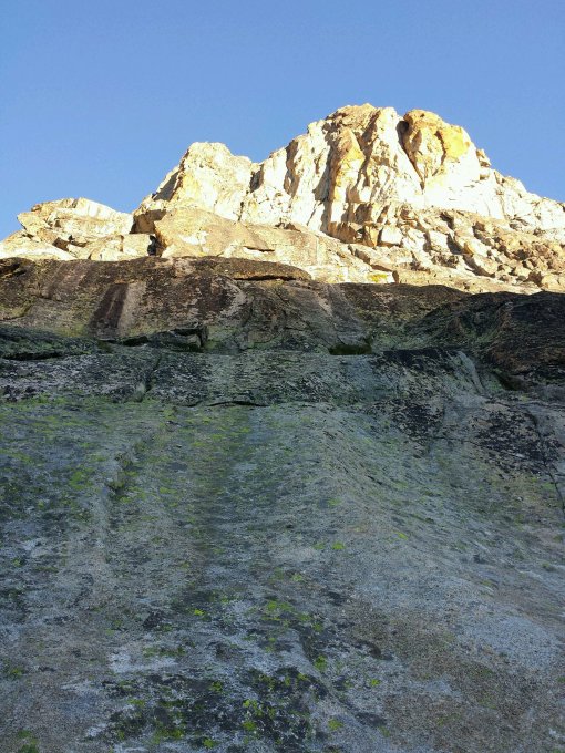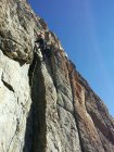 Die schwierigeren Längen sind top abgesichert und human bewertet. Friends und Keile haben wir keine benötigt, könnte man aber sehr einfach legen. Die letzten Meter am laufendem Seil zum Gipfel (2-3). Der Abstieg ist lange und mit einem 50m. Einfachseil nicht zu empfehlen. Die Abseilerei wurde so zum Abendteuer. Darum mind. ein 60m Einfachseil oder noch besser 50m Halbseil benutzen.