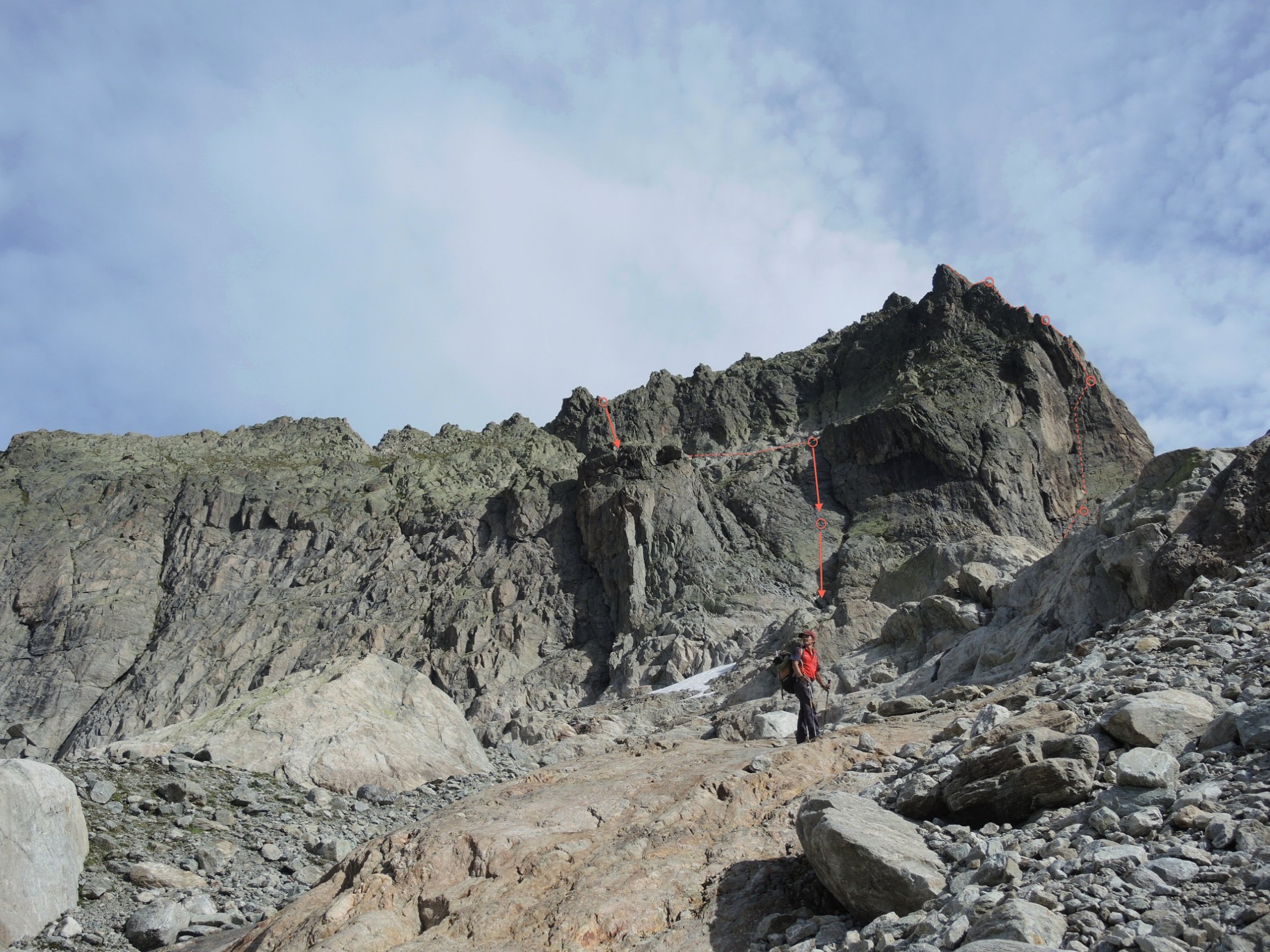 Abstieg: Zurück in die Gipfelscharte und ostwärs zwei kleine Türmchen übersteigen, resp. an einer Stelle kurz abklettern zu Abseilstelle in Scharte. Mindestend 25m Abseilen auf Schutt- oder Schneeband je nach Jahreszeit. In Laufrichtung leicht linkshaltend (südöstlich) zu weiterer Abseilstele (markiert: rote Punkte). 2x 25m Abseilen.