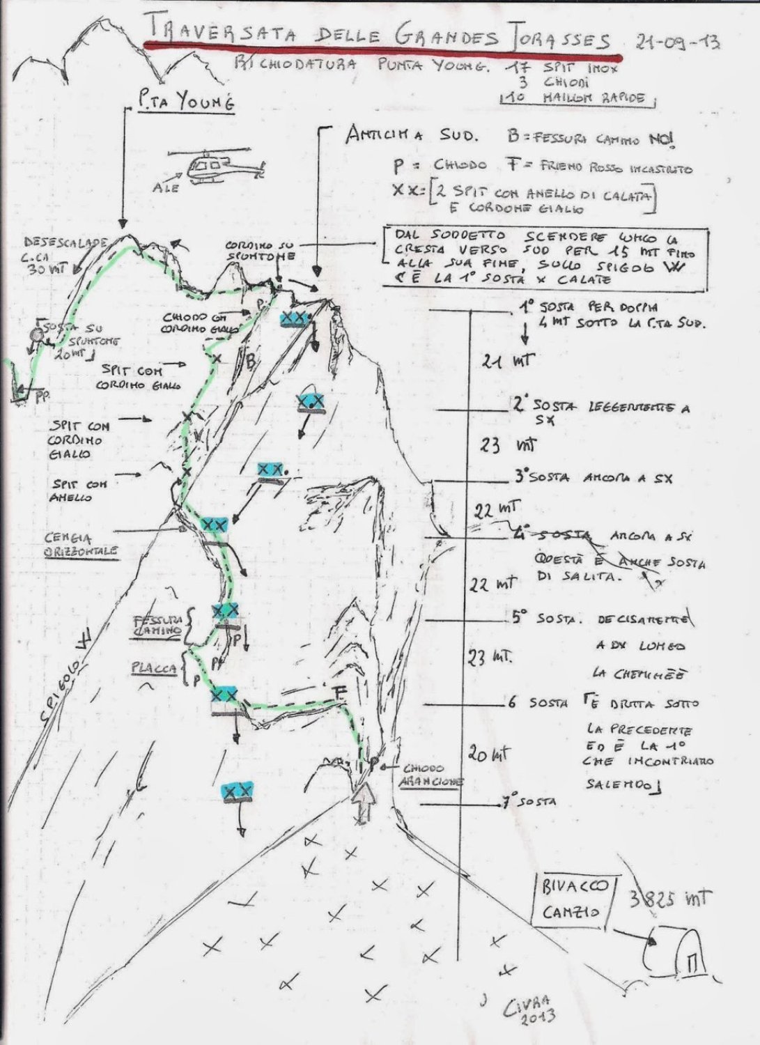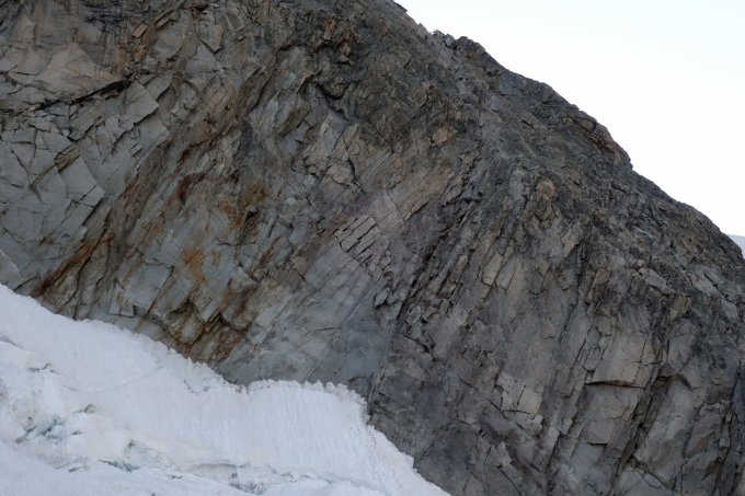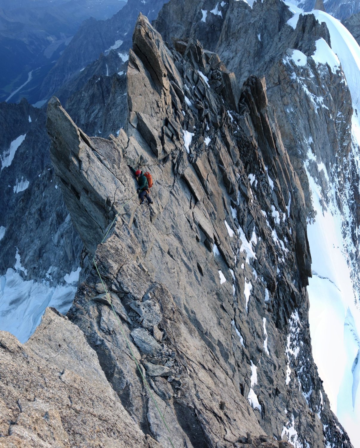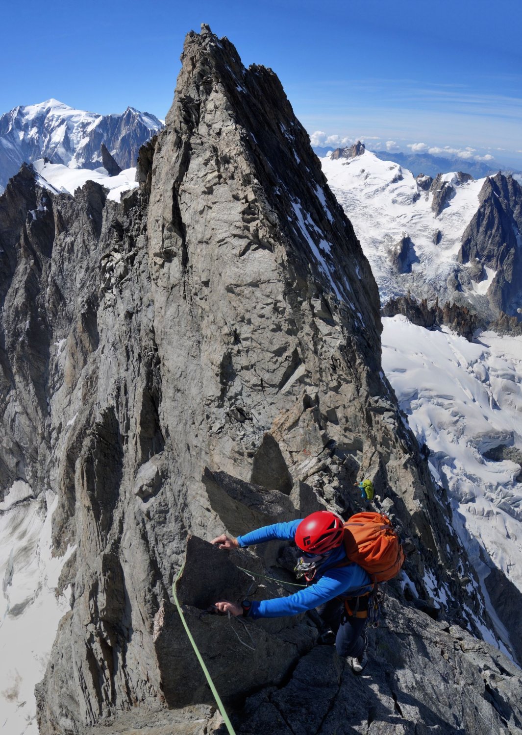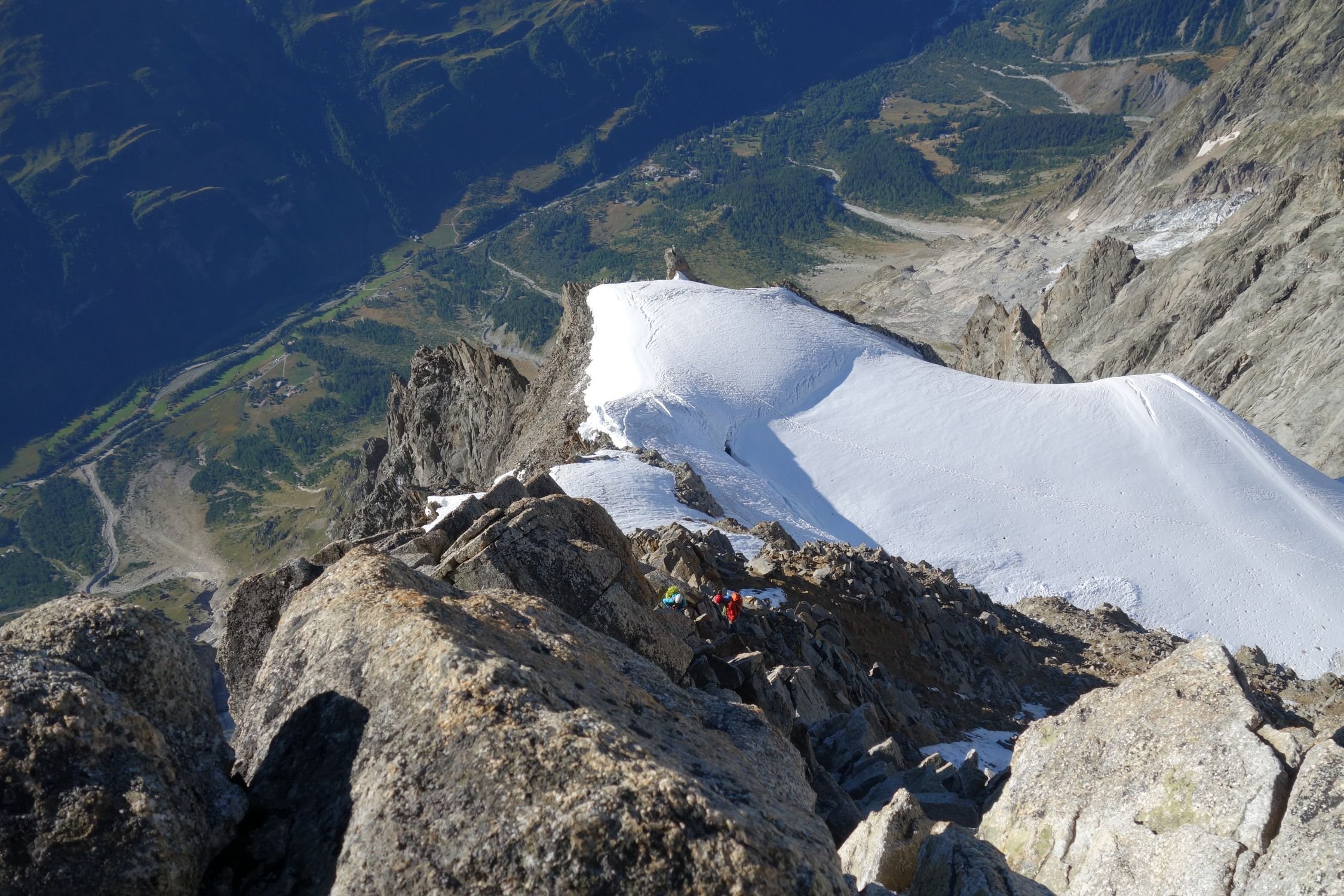 Von Pt. Walker dem breiten Firngrat entlang zur Pt. Whymper (15 min) welche über einige Felsen erstiegen wird. Dem brüchigen Grat folgend zur Pt. Croz und weiter einen Gendarm links umgehend dem Grat entlang auf die Pt. Hélène. Hier bessert sich die Felsqualität rapide. Weiter über den Grat auf die Pt. Marguerite. 2 x 20m abseilen (besser: 1x40m) führt in eine Scharte vor einer 5m hohen Felswand welche nordseitig über brüchige Felsen umgangen wird. Weiter dem Grat folgend, 2x30m abseilen, bis zu dem westlichsten Felsen der Pt. Young. Abseilring. Mehrfaches Abseilen (BH) nach rechts (nord) über die Standplätze der Pt. Young. Erreicht man nach der ersten Abseillänge einen Schlingenstand ist man falsch und muss weiter nach Nord, vgl. Topo.