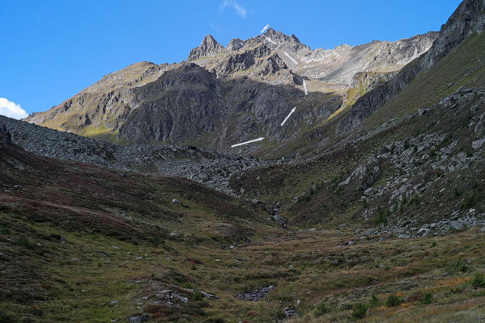 Grundsätzlich würde man den Kessel wohl einfacher weiter ostwärts über im Aufstieg klar ersichtliche Rasenbänder erreichen.