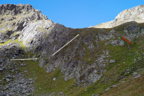 Der Durchstieg der Schrofenzone nach der Wegteilung auf etwa 2320 Meter Höhe kann bei Nässe, gefrorenem Boden oder Schnee heikel sein, es besteht in kurzen Stellen Absturzgefahr.