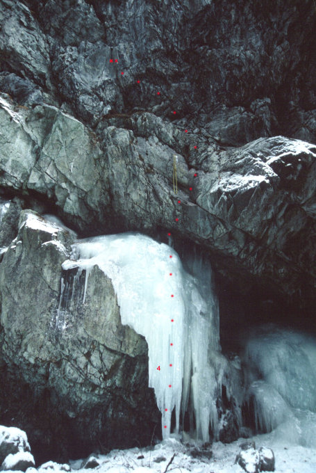 Verschiedene Fälle in unterschiedlichen Schwierigkeiten (ca. WI3-5) - auch Mixed Routen. Die Fälle können von oben eingerichtet und im Top-Rope geklettert werden.