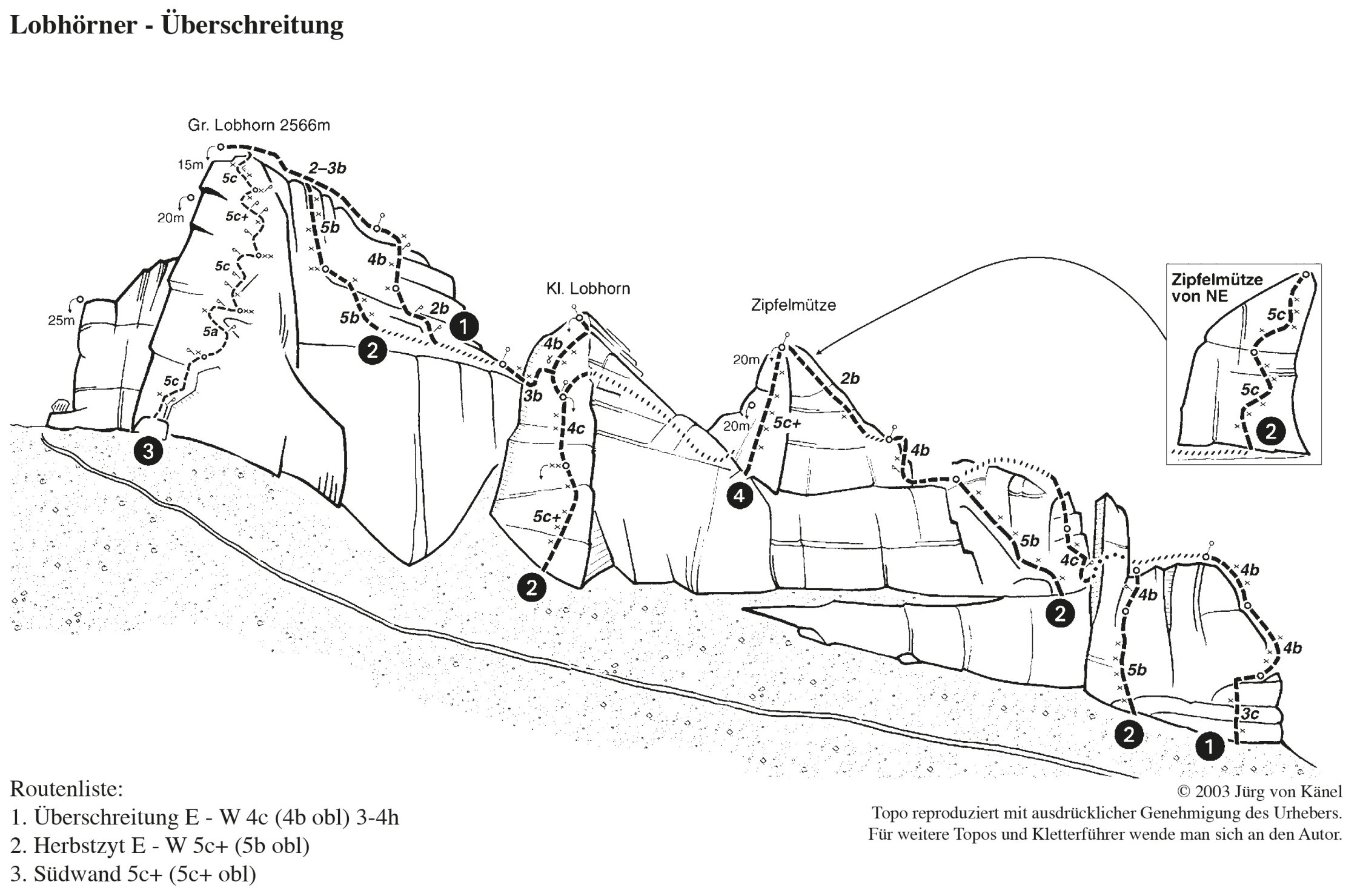 Der Einstieg ist einfach zu finden. Da wo der Wanderweg auf den Felsaufschwung der Lobhörner trifft, folgt man dem Weg noch wenige Meter bis unter einen Felsvorsprung, der sich gut für ein Depot eignet. Unmittelbar rechts davon startet die erste Seillänge. Diese wird von Jürg Känel mit 3c bewertet, der Start hat es aber in sich, weil der Fels ziemlich abgegriffen und speckig ist... Nach dem ersten Aufschwung geht’s auf einem Band nach rechts hoch zum ersten Stand. Diesen kann man auch auslassen und die zweite Seillänge (4b) gleich anhängen. Für die erste Seillänge gibt es auch eine Variante 5m weiter rechts, 1 Bh, nicht speckig aber etwas brüchig, ca. 3c. Die 2 SL führt bis auf eine Schulter, wo man selbst einen Stand einrichtet oder noch ein paar Meter bis zum Fuss eines Felsrinnensystems aufsteigt. Hier gibt es zwei Bohrhaken am Start der dritten Seillänge (4b), welche durch die Rinne rechts der deutlichsten Rinne hochführt. Nun geht’s wenig schwierig über den ersten Turm und über den Grat hinunter an den Fuss des zweiten Turms, den man meist rechts umgeht. Man kann diesen "Daumen" auch erklettern, erst über die Ostkante, dann nach rechts auf einem Bändchen in die Nordseite queren und durch einen Riss hinauf. Abseilen ca. 20m an den Start der 4. SL (4c). Dies ist zweifelsohne die Schlüsselstelle der Tour. Die ersten paar Meter haben es in sich (eher schwieriger als 4c), sind aber mit 4 Haken nun gut gesichert. Sind diese Meter geschafft, geht’s weniger schwierig bis zum Stand. Von hier geht’s in einfacher Kletterei rechts eine Rinne hoch und hinauf auf den Grat, welcher hinüber zum nächsten Felsaufschwung führt. Eine kurze Seillänge (4b) und Kraxelgelände führen auf die Zipfelmütze. Vom Zipfel der Mütze seilt man zweimal 15-20 m ab und steigt dann wieder hoch in den Einschnitt zwischen Zipfelmütze und Kleinem Lobhorn. Statt in der Falllinie abzuseilen, kann man mit etwas Geschick über den Grat in die Scharte abseilen. Das sind genau 25 Meter... Das Kleine Lobhorn muss man nicht besteigen. Man steigt in der Südflanke etwas hoch und quert diese unter dem felsigen Gipfelaufbau. Um den Geländerücken herum gelangt man in die Südwestflanke des Kleinen Lobhorns, durch welche man schräg nach unten in den Einschnitt zwischen dem Kleinen und dem Grossen Lobhorn (3b) klettert. Nun wartet noch die Besteigung des Grossen Lobhorns. Mein steigt über eine kleine Felsplatte und grasdurchsetztes Gelände schräg aufwärts zu einem ersten schmalen Felsband, über welches man durch eine Verschneidung hochsteigt. Wieder über Grasbüschel hinauf (dieses Mal mehr oder weniger in der Falllinie) erreicht man den Start zur Seillänge, die zum Grat führt (4b). Über diesen erreicht man in einfacher Gratkletterei den Gipfel.