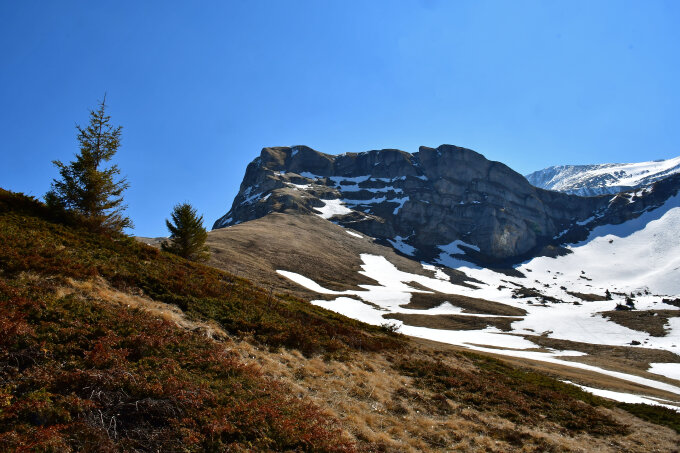Vom Tschingel Gipfel zu den Militäranlagen und dann weiter am Vorgipfel (Pkt. 2307m) vorbei (oder gleich mitnehmen)zum Sattel zwischen den beiden Gipfeln. Dann den Wegspuren in den Südhang weiter verfolgen bis kurz vor dem Gipfel den man über den Grat oder leicht Links (nördlich) davon in wenigen Schriten erreicht.