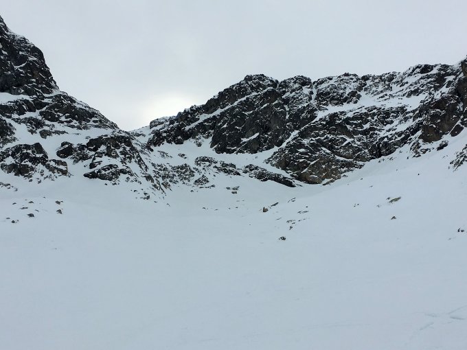 Von la Veduta 2238 m zu P. 2449. Weiter Traverse zu P. 2633 und steil hinauf zu Seelein. Dann südostwärts auf Rücken bis Gipfel. Für Nordabfahrt kurz nach Gipfel in das breite und sehr steile Nordculoir hinab, teilweise grössere Felsblöcke umfahren bis eine steile Felsbarriere. Diese Schlüsselstelle links umgehen. Nachher wird das Gelände sanfter und den letzten Felsriegel kann rechts umfahren werden. Weiter Traverse Richtung la Veduta. ZS+.