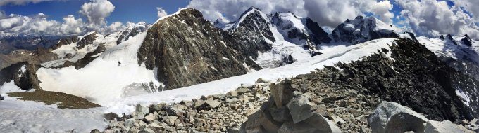 Auf etwa 3'100m erreichen wir die sogenannte Terassa und auch den Rand des Gletschers. Da ich alleine unterwegs war und bereits Mittagszeit war, habe ich mich gegen die einfachere Variante über den Gletscher entschieden und bin dem Gletscher entlang nach Norden. Dort wo er dann eine Biegung nach Osten macht, habe ich mich für den Aufstieg in der Süd-Ost Flanke des Piz Tschierva entschieden. Hier gibt es keinen Weg! Auf dem Kletteraufsteig habe ich einige Steinmandli selber erstellt um den sichern Abstieg wieder zu finden. So steil dieser Aufstieg ist, so plötzlich geht er in ein Gipfelfirnfeld über, welches flach vor einem liegt. Noch 30, 40 Höhenmeter und man steht auf dem Gipfel! Wunderschöne Rundumsicht - inklusive natürlich der Berninagruppe. Das schönste: Man ist hier fast immer alleine!!