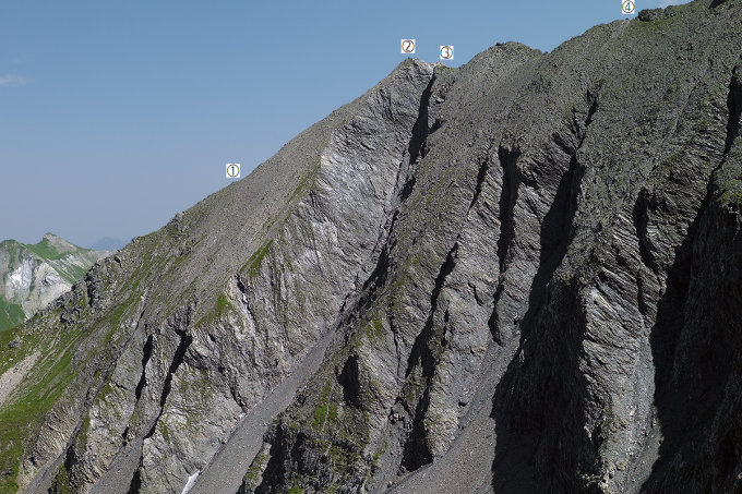 Vom Gipfel des Gspaltengrats steigt man südseitig über schuttbedeckte, brüchige und auch etwas heikel zu begehende Schieferplatten in die Kerbe im Gratverlauf zum Älplichopf (2641 m) ab.