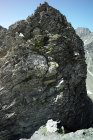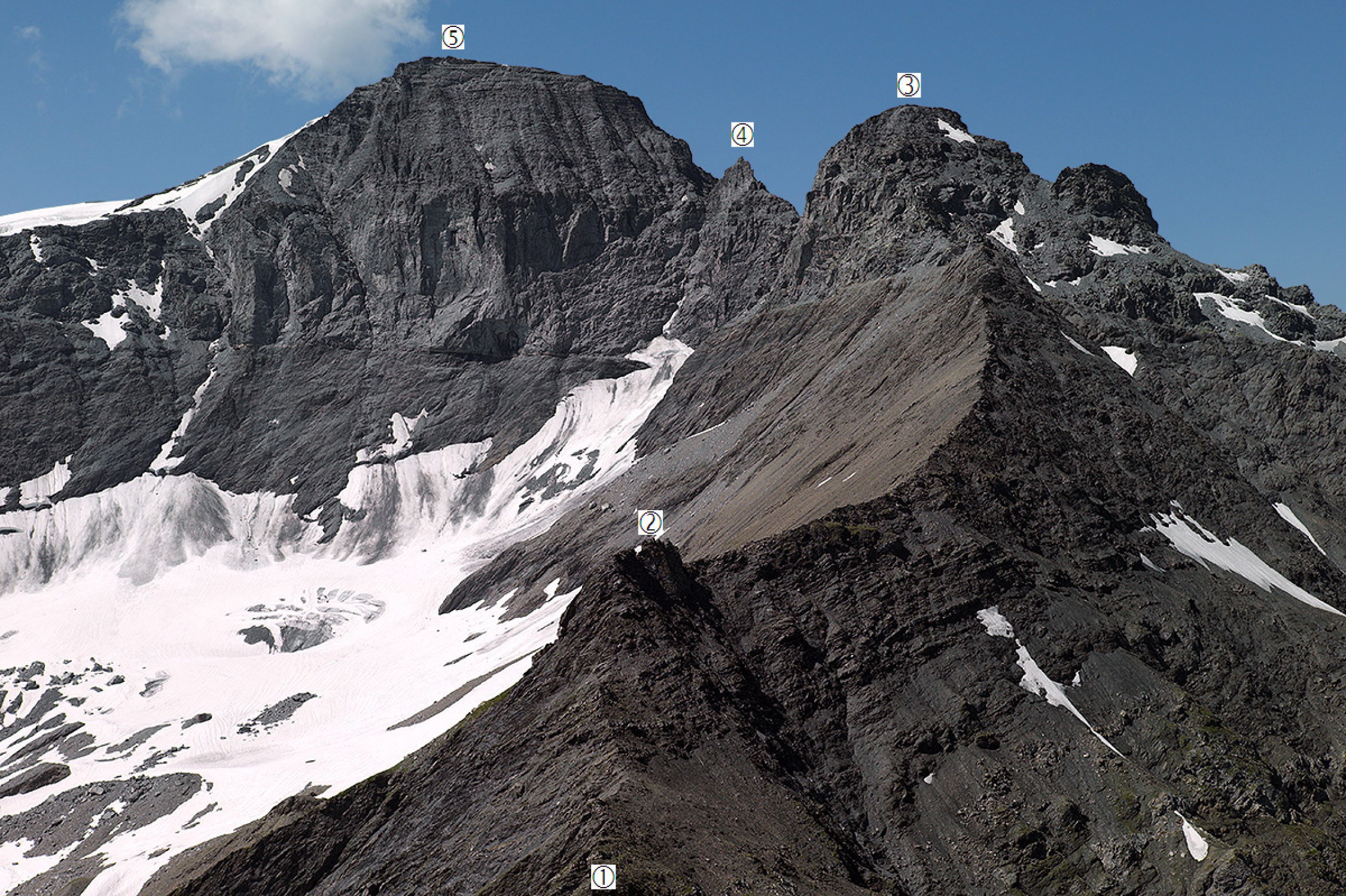 Schwierigkeit: bis T6-, brüchig, in Gipfelnähe heikle Plattenzone, die den Einsatz der Hände erfordert.