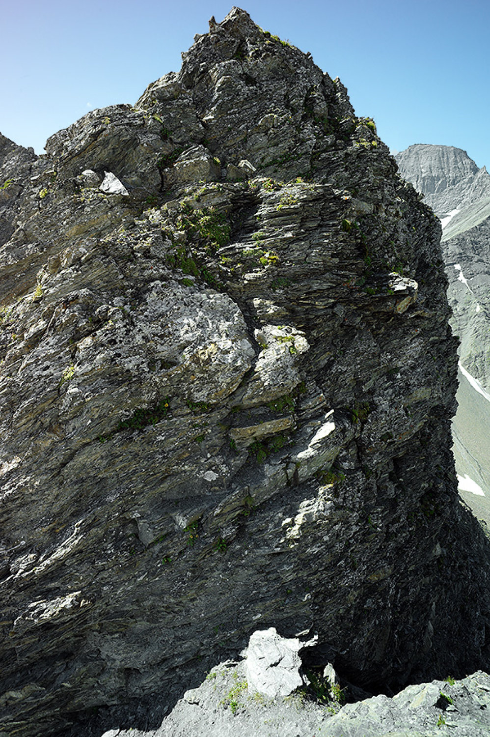 Von hier folgt man mehrheitlich im Schutt mit hie und da etwas leichter Kletterei in festem Blockwerk dem Grat zum Gipfel des Gspaltengrats.