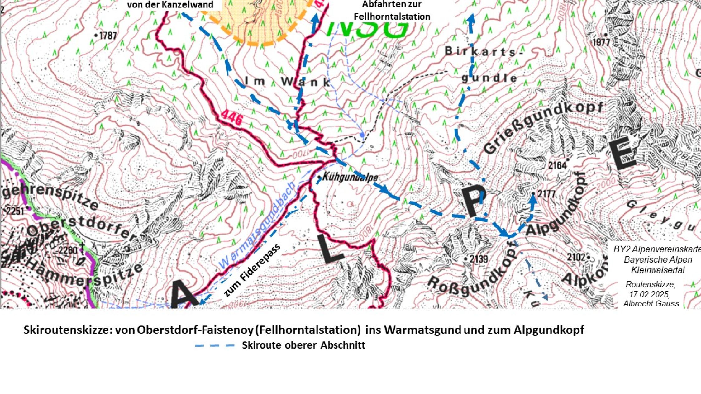 - Ins Warmstsgund und über den Almweg mit z. T. leichten Gegenaufstiegen zur Mittelstation der Fellhornbahn (ca. 1300 m) und auf der Piste zur Talstation (ca. 900 m). Zu beachten ist, dass ab 17:00 Uhr die Pisten wegen Pistenraupentätigkeiten unter Einsatz von bis zu 1.000 m langen Stahlseilwinden auch für Abfahrten von Tourenfahrern gesperrt sind (https://dein-allgaeu.de/berge/pistenpraeparierung-mit-seilwinden/). Letzte Busoptionen s. o..