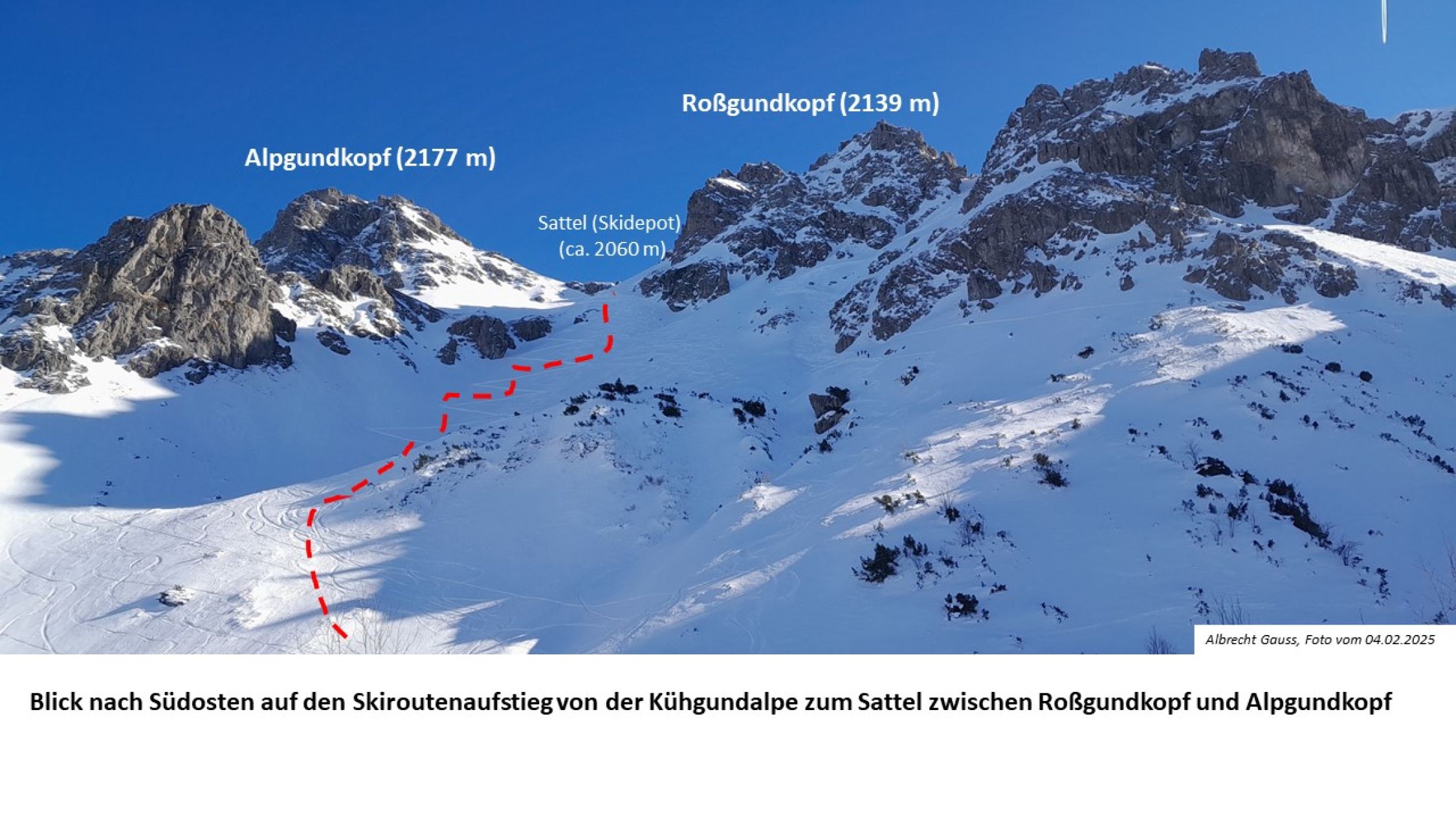 Bei sicheren Verhältnissen von der Kanzelwandbahn-Bergstation (beim Gundkopf) westlich am Kanzelwandgipfel (2058 m) vorbei in die Scharte südlich des Kanzelwandgipfels (oft Wächten). Von dort ins Warmatsgundtal in das Gebiet „Im Wank“ bis auf ca. 1600 m hinab. Von dort durch Birken- und Latschengelände nach S, später SO in das Gebiet der Kühgundalpe (z. T. in Spitzkehren) hinauf (bei geringer Schneelage wenig erfreulich, v. a. wenn Schneehöhe <1–1,5 m). Dabei am Ende Spur so anlegen, dass bei der Rückfahrt möglichst keine Gegenaufsteige entstehen. Von der Flachzone bei der Kühgundalpe Richtung O gehen und die zunehmend steiler werdenden Hänge unter der Roßgundkopf-N-Flanke Richtung SO aufwärts bis man für die letzten ca. 100 steilen Höhenmeter in das obere Hochkar einschwenkt, über das man in den Sattel/Scharte zwischen Roßgund- und Alpgundkopf (ca. 2060 m) gelangt. Skidepot. Zu Fuß über den SW-Grat (I) zum Gipfel, wobei man felsige Aufschwünge i. S. des Aufstiegs rechts (SO-Seite) umgehen kann.