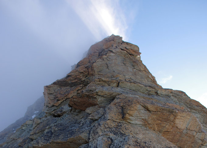 Nun gemäss Route 593 über den wunderbaren, felsenfesten Rothorngrat. Am besten überklettert man die Gendarmen, welche klettertechnisch zunehmend schwieriger werden (bis 4b), direkt. Nach dem vierten und höchsten Gendarm erreicht man die Gabel, wo man auf die Normalroute trifft. Auf dieser über die Binerplatte (BH und Sicherungsstangen) und exponiert um die Kanzel auf den Gipfel.