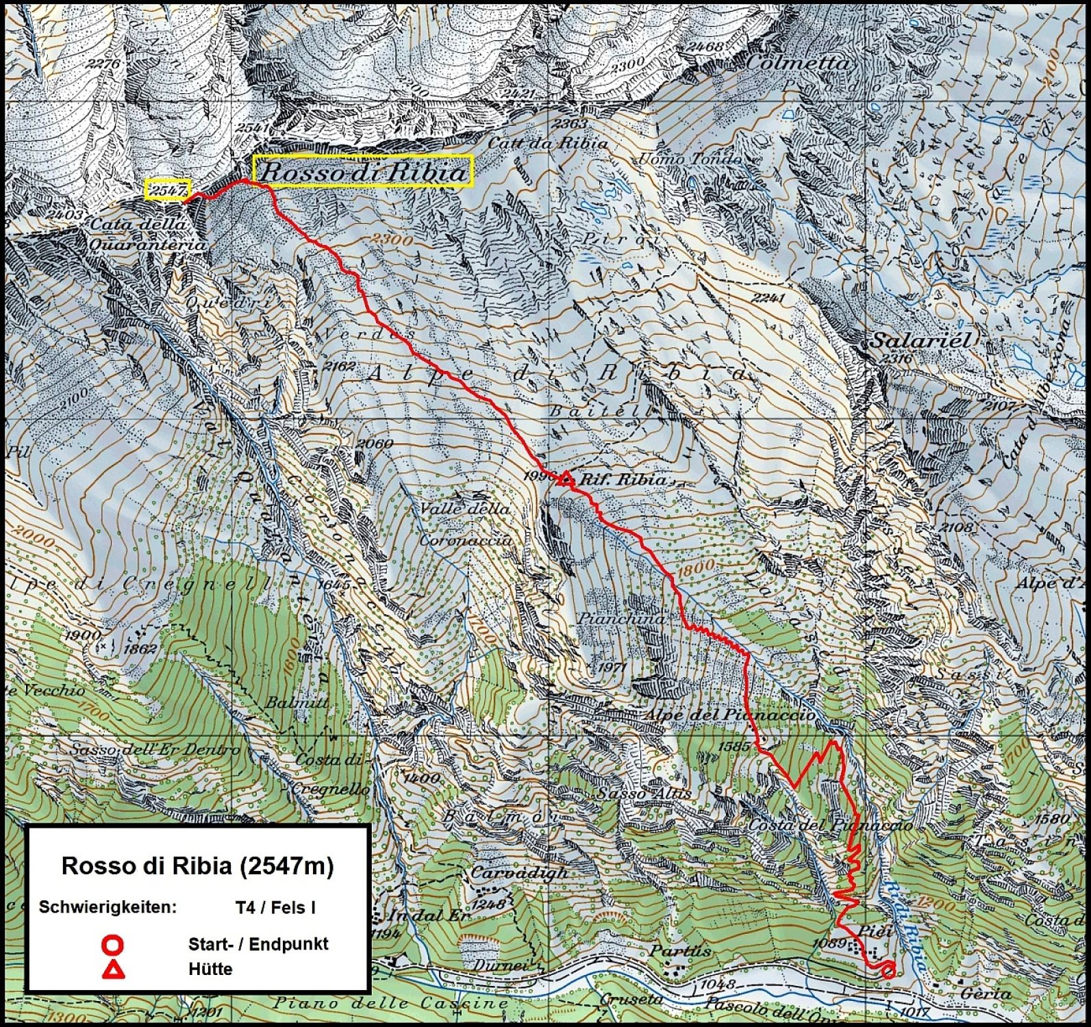 Ab Capanna Ribia in NW Richtung über mit Steinmännern gekennzeichneten Pfad (schwer erkennbar). Dann (ggfs.im Schnee) zur markanten Rinne, die von unten recht nach oben links zieht. In der Rinne, welche sicherlich knapp 40° Steilheit besitzt, hat es 2 Fix seile. Je nach Jahreszeit über Schnee oder Geröll hoch zur Scharte. In leichter Kletterei zum Gipfel.