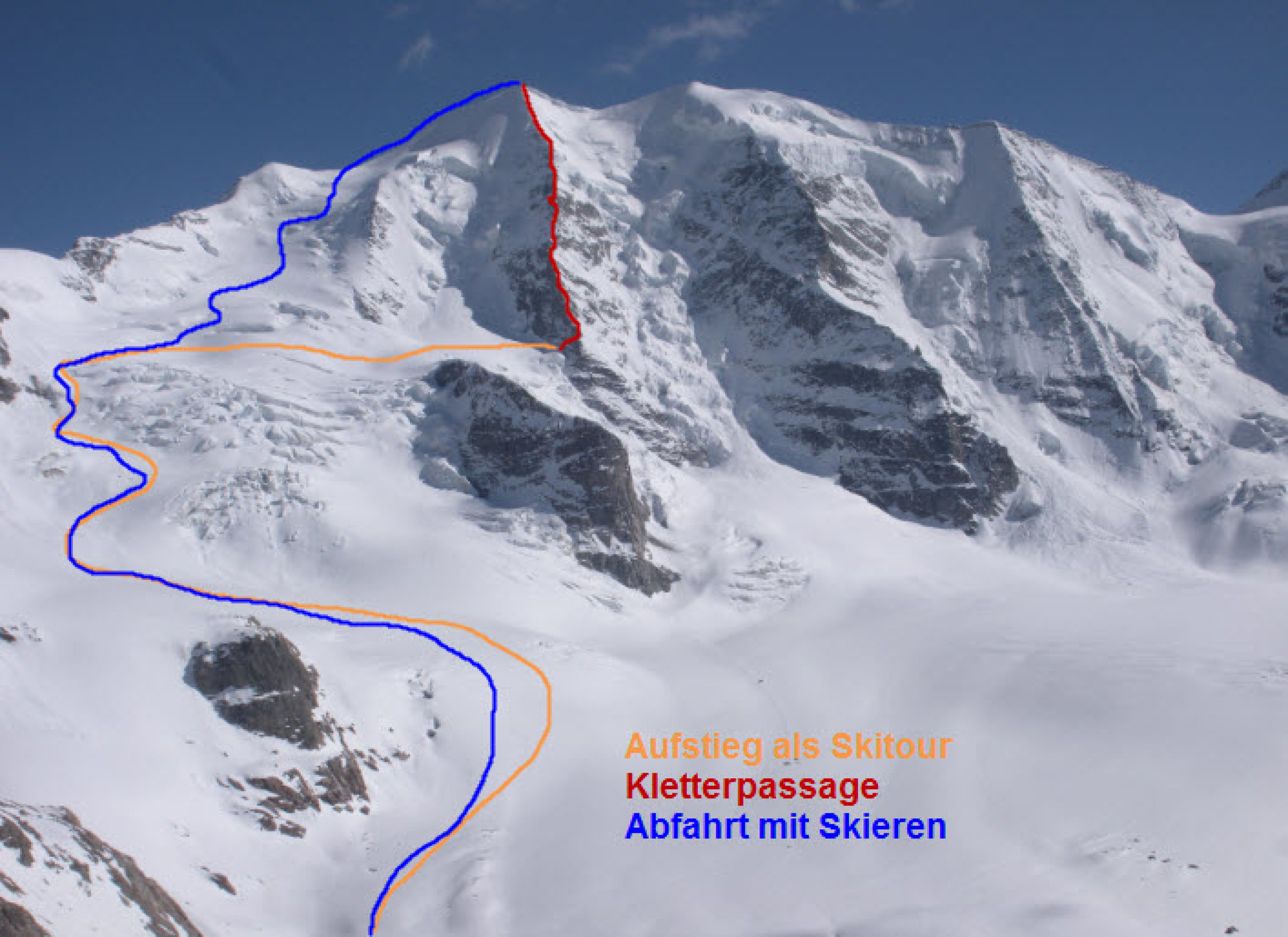 Aufstieg auf der Normalroute vom Piz Palü. Abfahrt ueber die Nordwand.