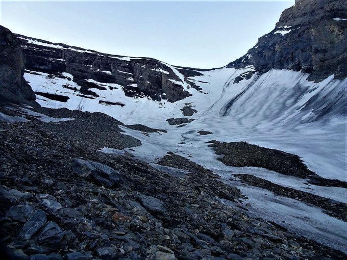 Für den Abstieg wählt man nach dem Gletscher den Pfad welcher zur rechten Mörane führt. Viele Steinmänner vorhanden. Dort auch guter Biwakplatz auf ca. 2400 m. Abstieg 1800 hm bis Spittelmatte.