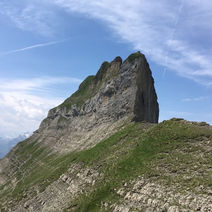 Anschliessend auf grasigem Gelände sehr steil (50 Grad) hinauf auf den Druesberg-Grat. Bei Nässe gefährlich. Ein Pickel leistet hier gute Dienste.