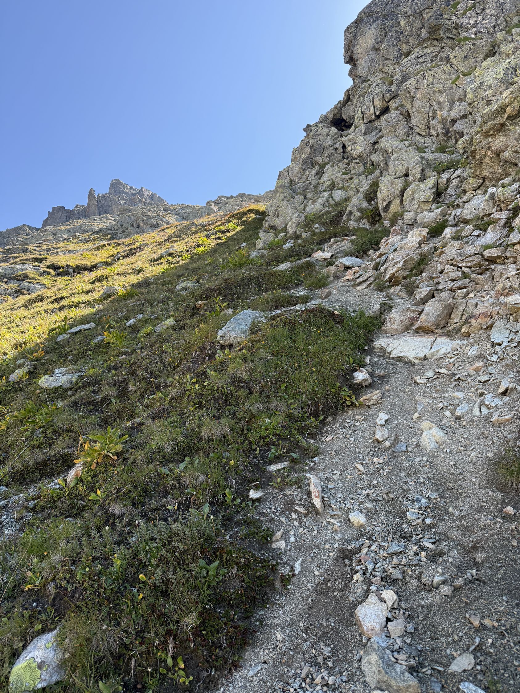 Von Julierpass La Veduta 2237 m Richtung Norden auf Wegspuren (Steinmännchen, in Karte eingezeichnet, nicht markiert) bis unter markannten Steinmann, den Steinmann gibt es leider nicht mehr, Lawine? Diesen nördlich umgehen und die nächste Geröllhalde überqueren und über die Nordflanke auf Westflanke. Nun Richtung Westen, zuerst über Grashänge und später über Blöcke zum Gipfelaufbau. Den markanten Kamin aufklettern bis Gipfel (III). Bis Kamin T4+,Kamin T5.
