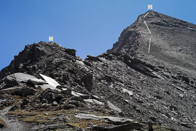 Vom Rossbodenjoch (2744 m) folgt man im Geröll der breiten Nordwestflanke auf fast durchgehend ausgeprägter Begehungsspur immer westseitig dem Nordgrat. Die Felsstufen bei Punkt 2844 zu Beginn des Anstiegs werden dabei mit unbedeutendem Höhenverlust westseitig umgangen. Ab etwa 3000 m Höhe wird der Anstieg spürbar steiler und des Gerölls wegens auch mühsamer, weist aber bei schnee- und firnfreier Flanke bis zum Gipfel weiterhin keine eigentlichen Schwierigkeiten auf.