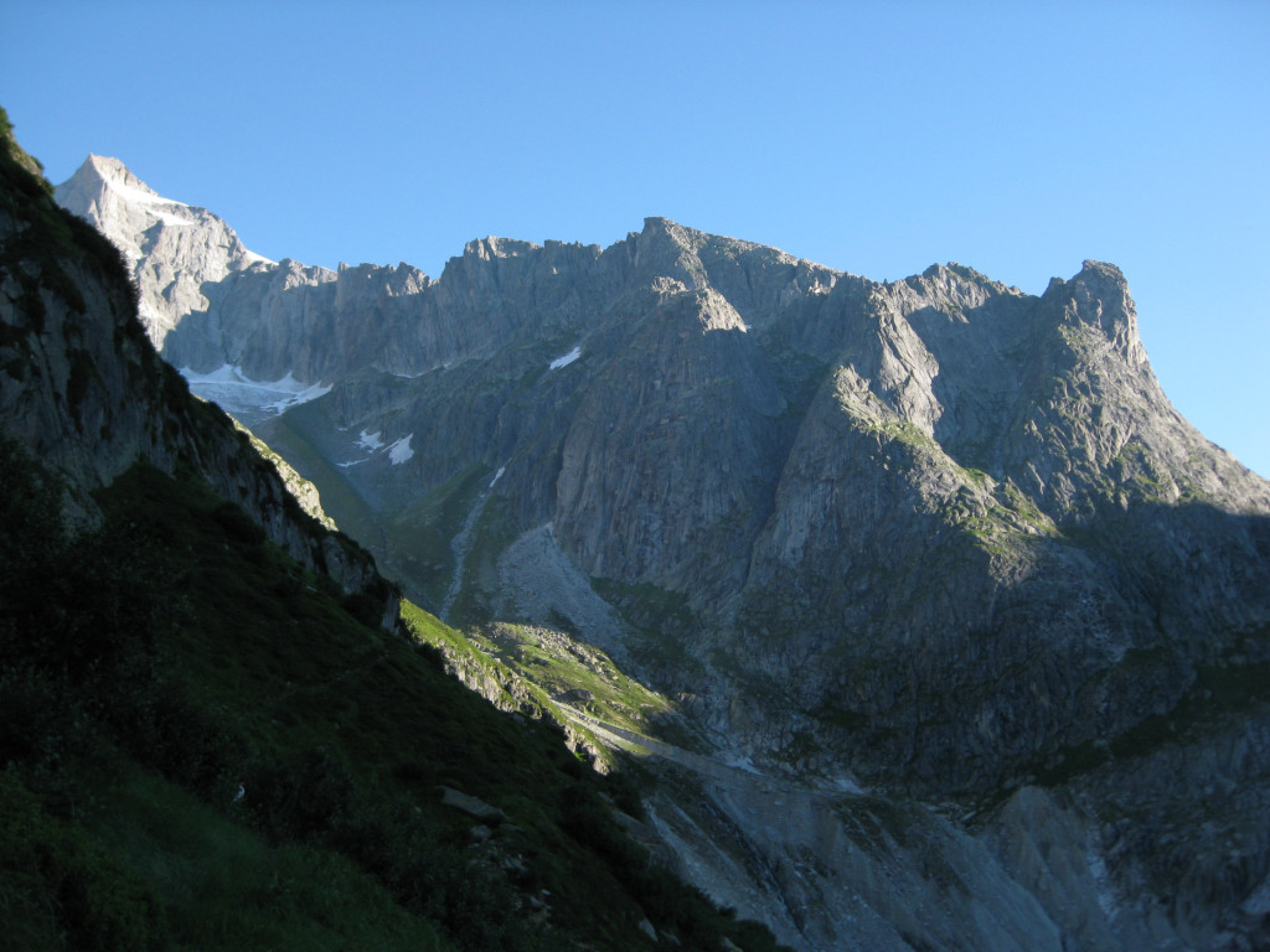 Danach weiter der Wegspur entlang, zuletzt über mehrere Couloirs und Bachrunsen und ein grosses Blockfeld unter das markante Granitdreieck des "Dôme de Slot". Zeitbedarf gut 2 Stunden ab der Burghütte, oder 3.5 Stunden von Fieschertal.