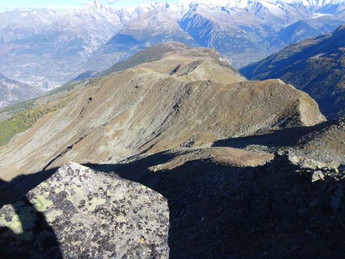 zwischen Gipfel und Vorgipfel in einem grossen Bogen südwärts ausholend in den Geröllhang. Diesen direkt westwärts hinunter Richtung Chatzulecher 2773m – Ischflie 2579m. Nun nordwärts Richtung Galu auf den Grasrücken. Danach westwärts absteigend zu Pkt. 2431 – Pkt. 2361 und Pkt. 2191 Obere Schwarze Wald. Nun dem Pfad/Weg folgen nach Arb – Finilu – Bord – Gspon 1893m.