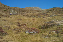 Anschliessend steigt man auf einer gut ausgeprägten Pfadspur erst über die Ostflanke, dann dem wenig ausgeprägten, rückenartigen Südostgrat folgend zum höchsten Punkt.