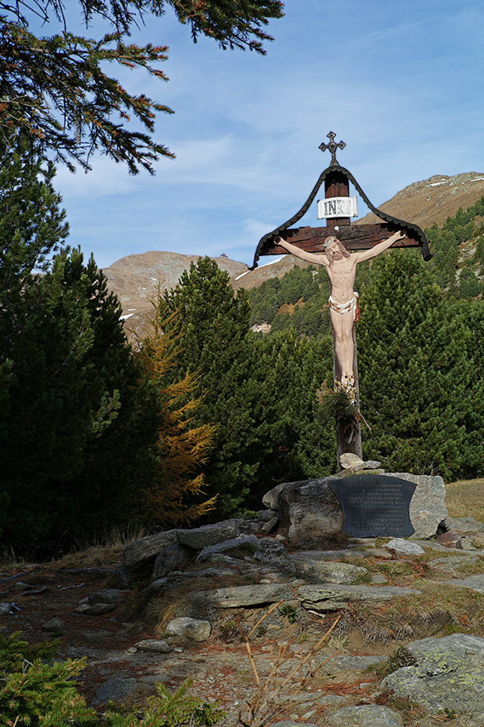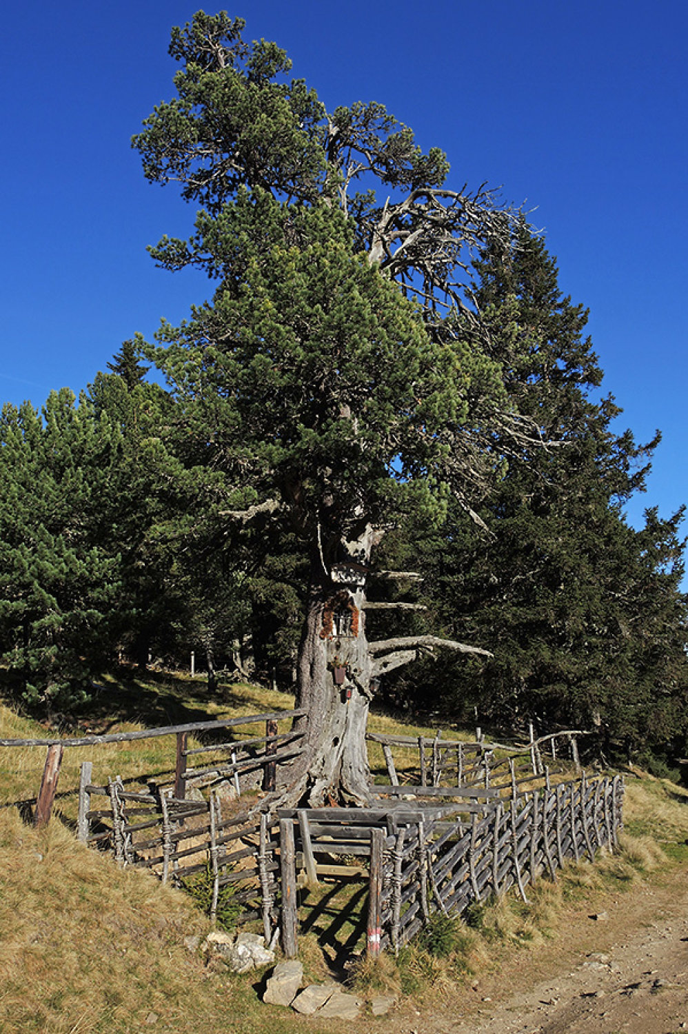 Von hier wandert man auf einer Naturstrasse durch schönen Nadelwald (Zirben) über den Rastplatz 'Maria in der Zirbe' zum Türkenkreuz.