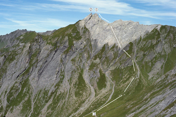 Aus dessen obersten Winkel, dem sogenannten Munggentäli, steigt man über einen Grashang zur breiten Schuttrinne empor, die sich zum Sattel nordöstlich des Nordgipfels emporzieht. Durch diese gelangt man etwas mühsam, aber ohne Kletterei auf den Nordostgrat.